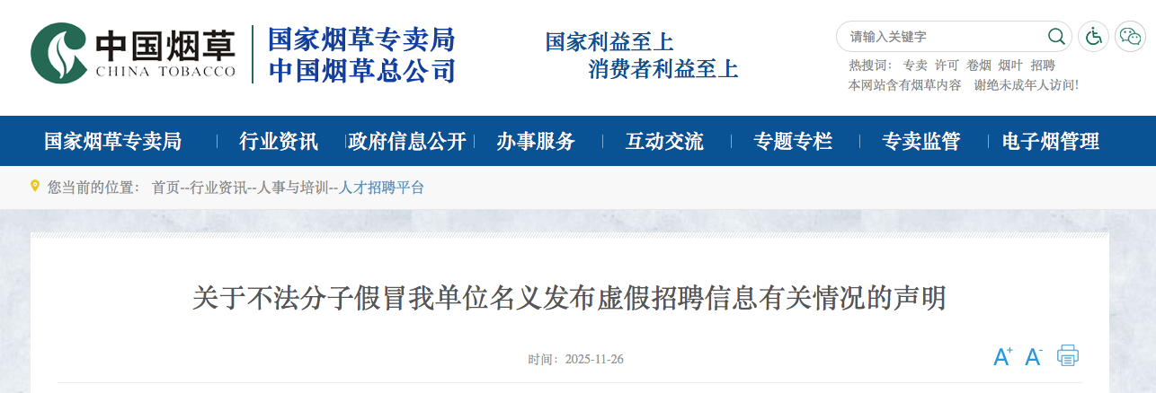 近期,国家烟草专卖局、中国烟草总公司(以下称我单位)接到反映,有部分培训机构、自媒体等账号通过网络平台,假冒我单位名义虚假发布“中国烟草总公司2026届校园招聘”等信息。此类行为对社会公众造成了严重欺骗与误导,侵害了广大求职者及我单位合法权益。现郑重声明如下:
